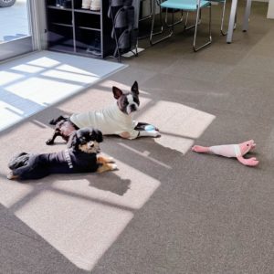奥から、ボストンテリアのハラちゃんとチワックスの颯(はやと)くんです。